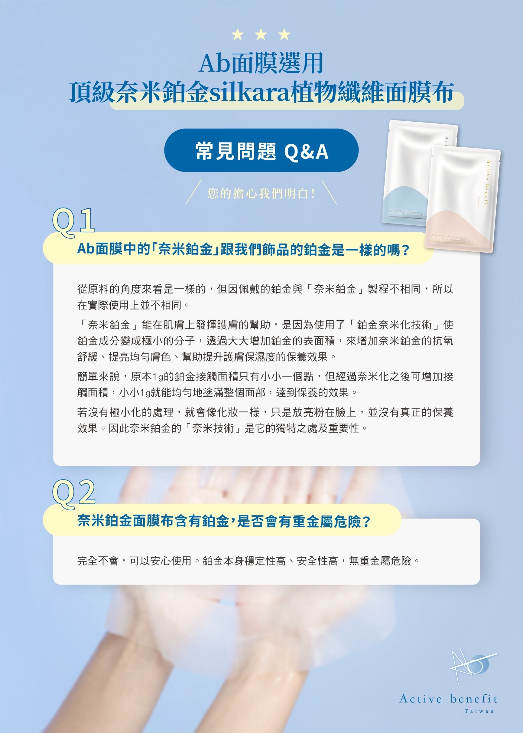Ab面膜選用頂級奈米鉑金silkara植物纖維膜布,能抗氧舒緩、幫助提升肌膚保濕度及防禦力。